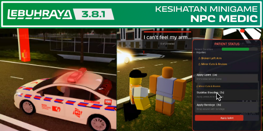 - Full medical emergency response minigame for the Kesihatan team — go on duty, get dispatched to injured NPC patients, and treat them